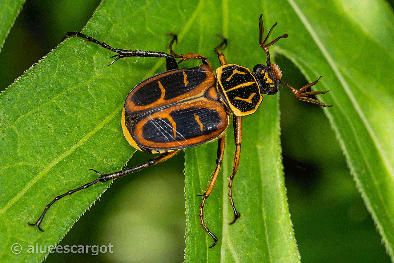 7月に入り、今年もダメかとあきらめていた矢先、別のムシを撮るためカメラをセットしている真ん前の葉の上にオオトラフコガネが舞い降りた。あり得ない ” 奇跡 ” v(^^)v