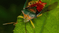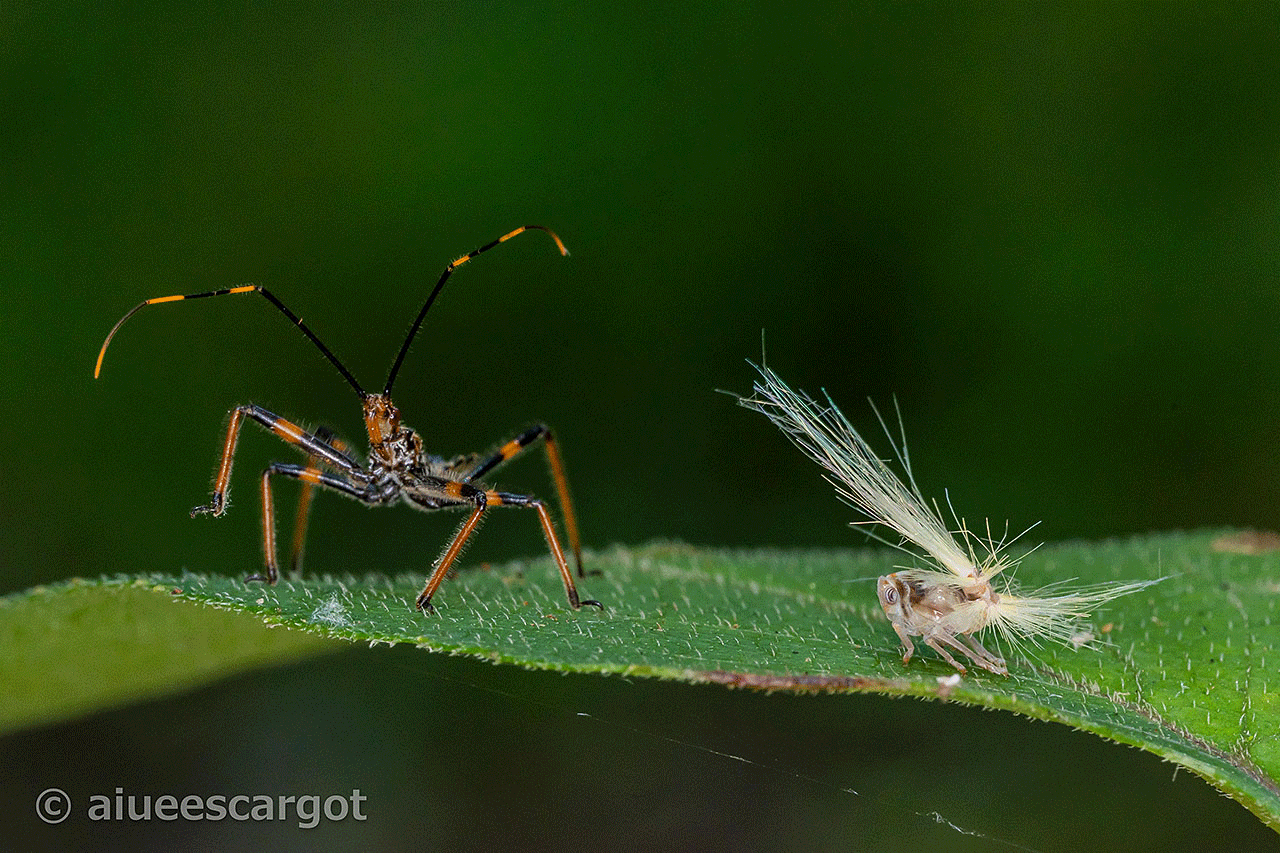 威嚇ポーズを繰り返すオオトビサシガメの幼虫に対し、ベッコウハゴロモの幼虫は常に ” 冷静 ” 。