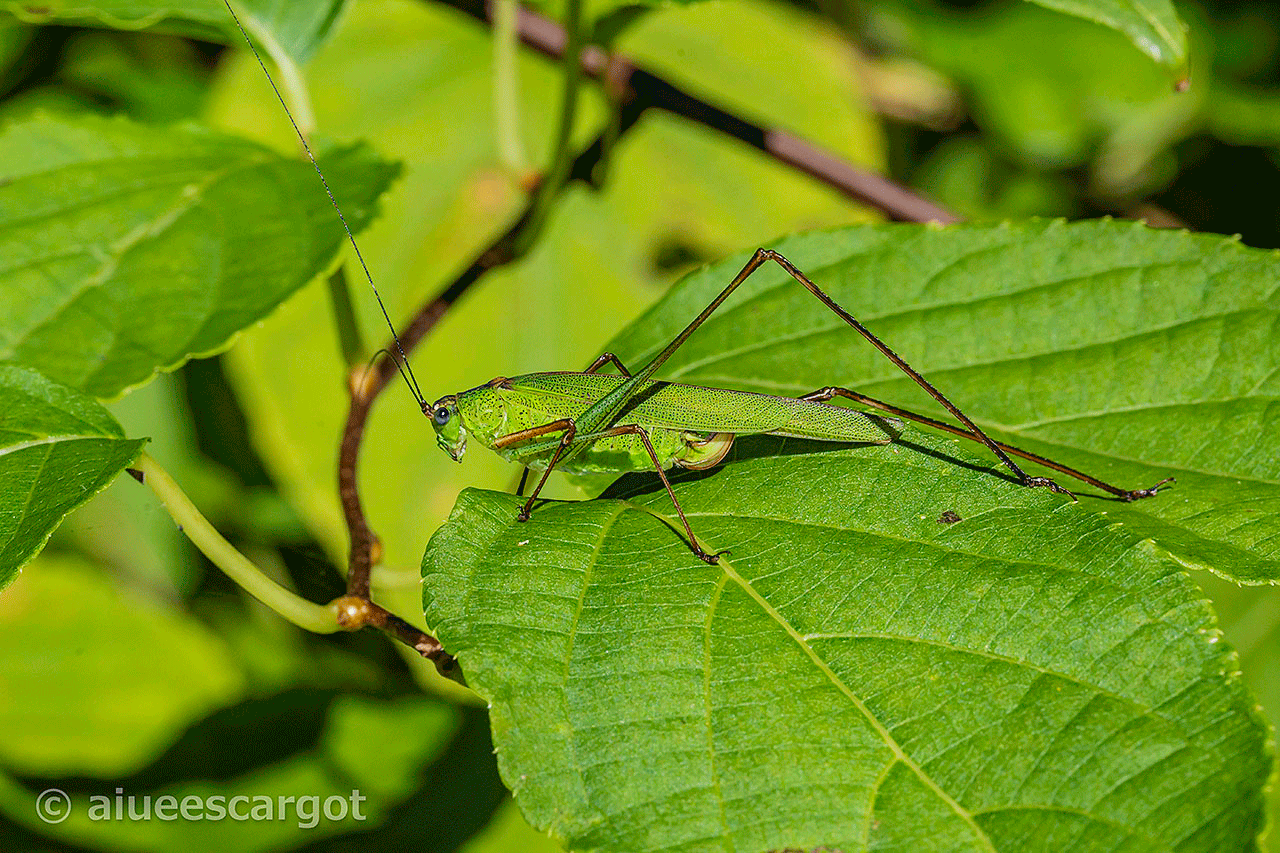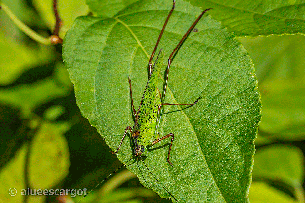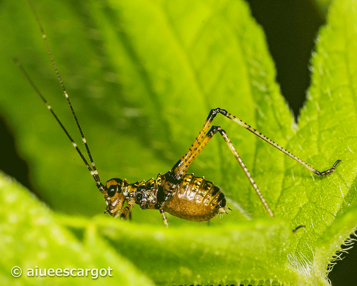 アシグロツユムシは初齢幼虫のころから成虫になるまで継続して見る機会が多いキリギリスの仲間。