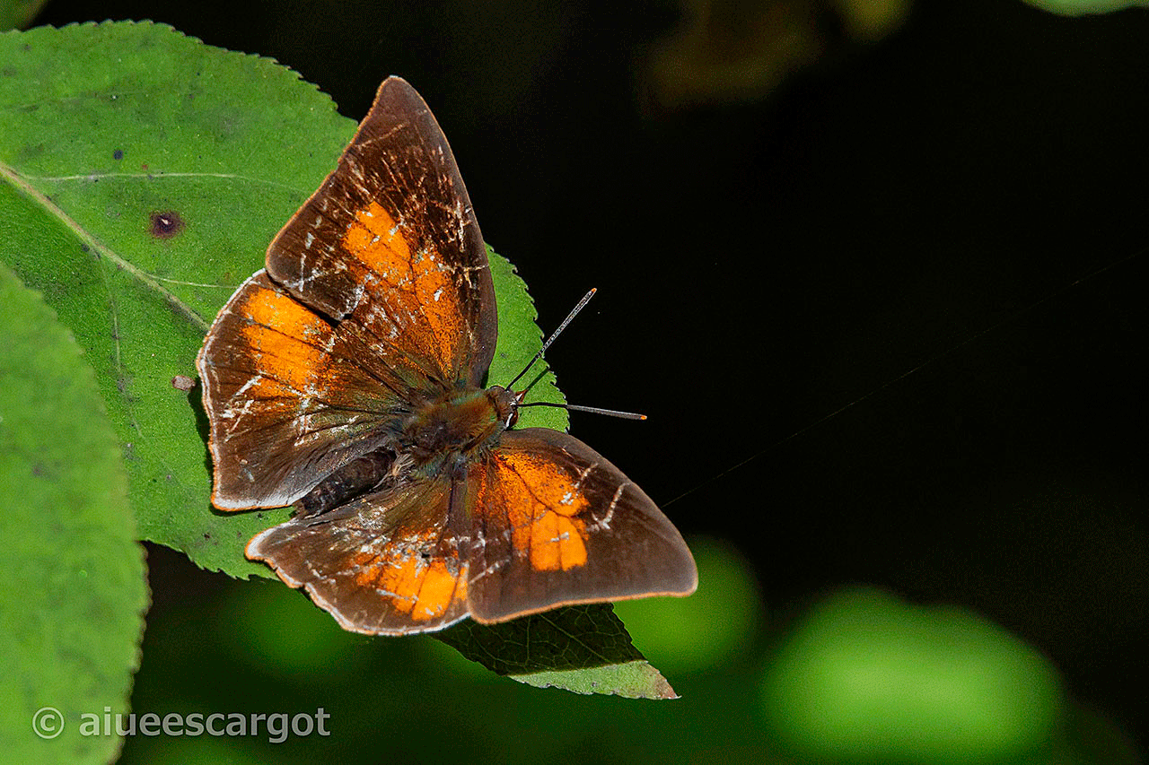 下の画像はオス。翅の表は濃いめの茶色にオレンジ色の紋。