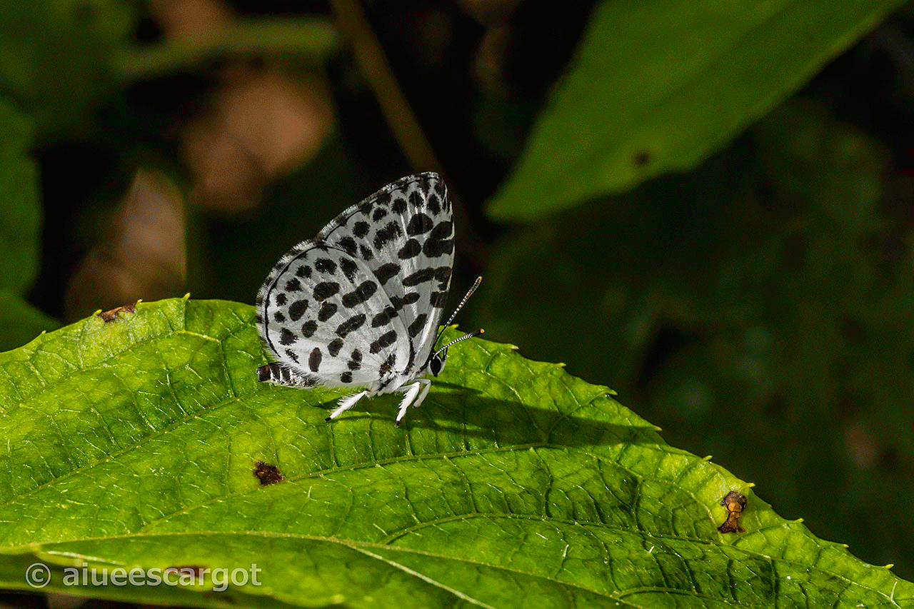 ゴイシシジミの翅の裏の模様は白地に黒の斑点。ゴイシシジミの名前はこの模様が囲碁で使う碁石に似ていることに由来しているそうだが、ワタシは名前を “ゴイシジミ” と、よく間違える(どうしても “シ” をひとつ抜かしてしまうのです)(>_<)ヽ