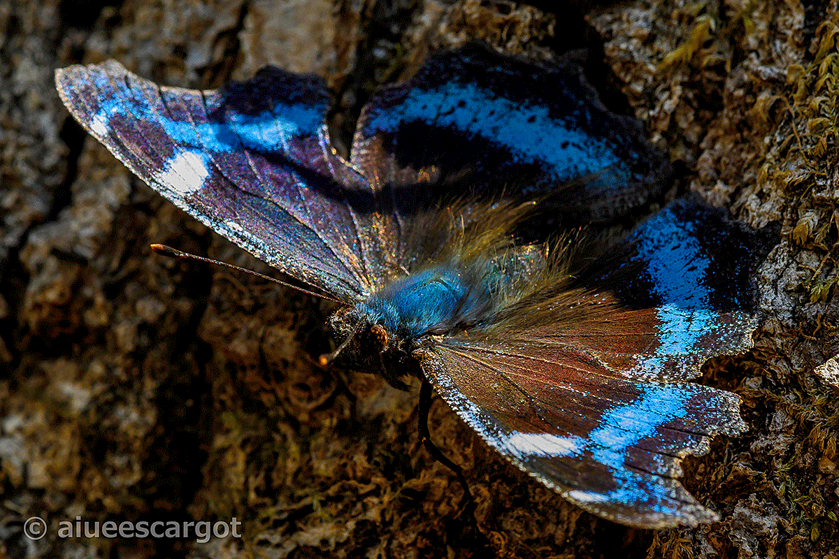はねを閉じているとさほど目につかないのに、”ひなたぼっこ”をしているときのルリタテハは実に目立つ存在。
