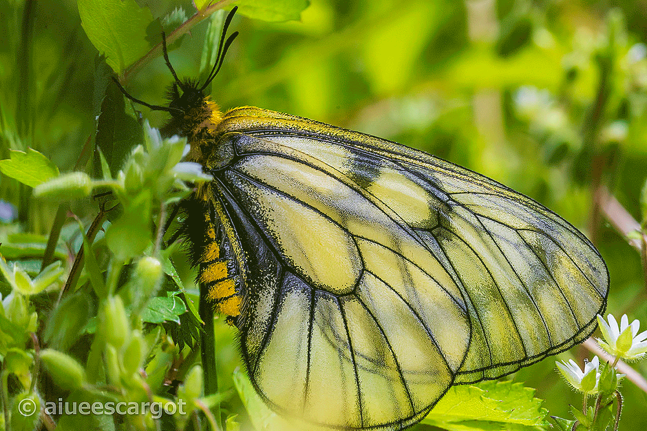 さて、翅を休めるウスバシロチョウをみるのはもちろん初めてですが、曇りガラスで造られたようなその姿は、自然色のステンドグラスのようでほんとうにキレイ。