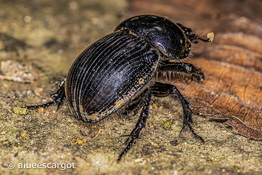 今回はワタシの気配を感じたのか、歩道の真ん中でフリーズ状態になっていた黒みがかったセンチコガネ。色合いより、体面に入った細かいカスリ傷のような反射が気になった。