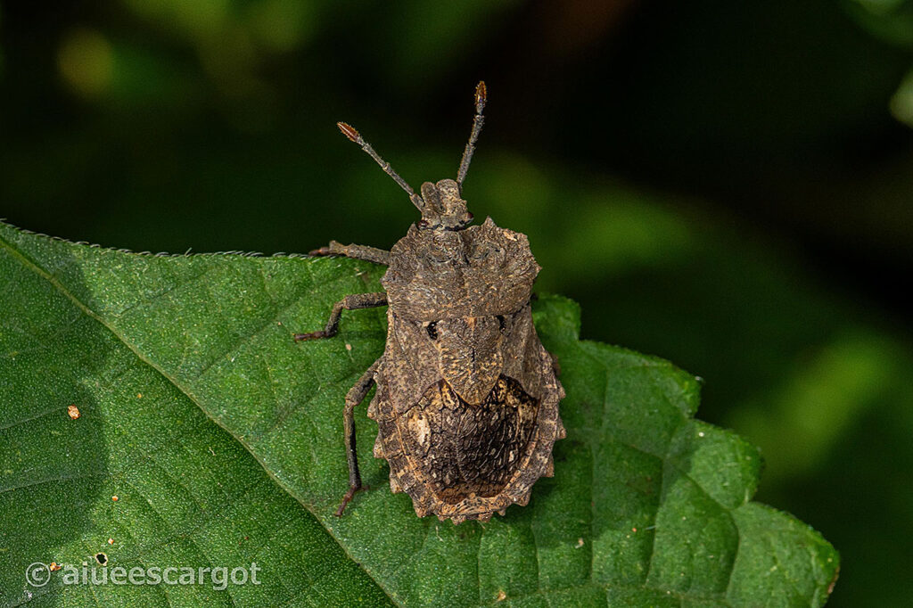 小さいが濃い茶褐色で全身ザラザラ、ゴツゴツの錆びた鎧をまとったようなノコギリカメムシ。