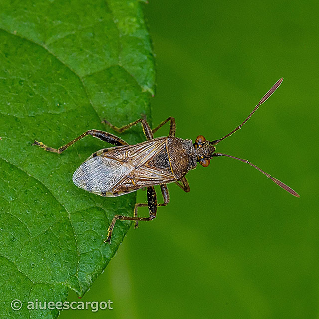 朝露に濡れた葉の上で、日向ぼっこをしているようなホソヘリカメムシ。