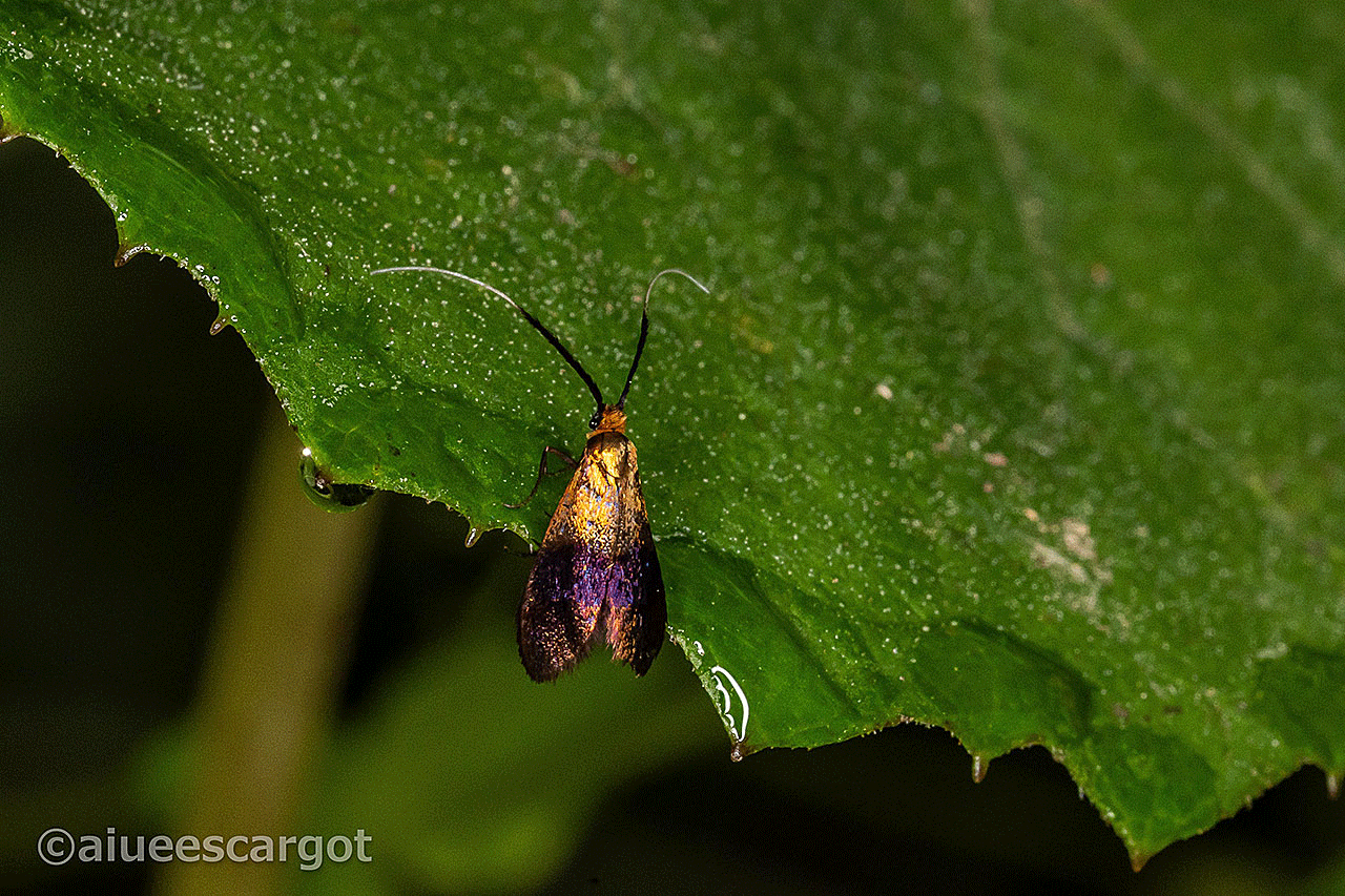 もっとも、みる角度によって前翅の黒褐色で暗い紫色の太い帯がほぼ真っ黒にみえたりするので、クロハネシロヒゲナガを観察するときの角度は大切。