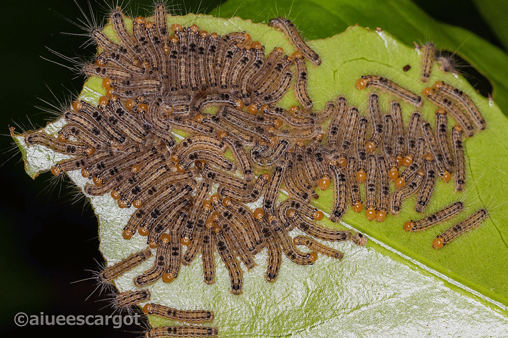 ルリタテハは青い帯が印象的な美しいチョウですが、終齢幼虫はサボテンのような淡い黄色のトゲを全身にまとい、その付け根はだいだい色。おまけにトゲの先端がうっすら黒くなっていて、いかにも毒があるような姿をしているが・・・じつは無毒🎇