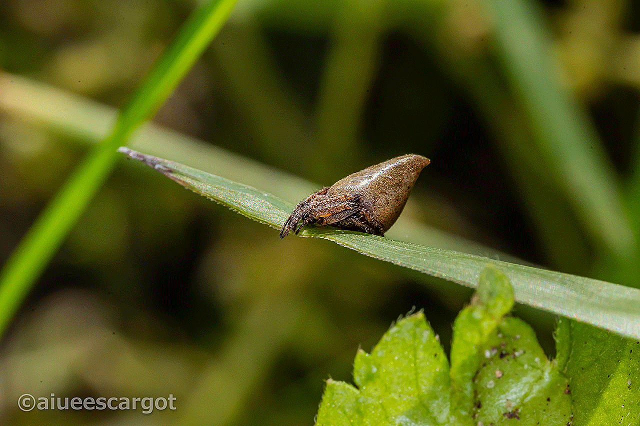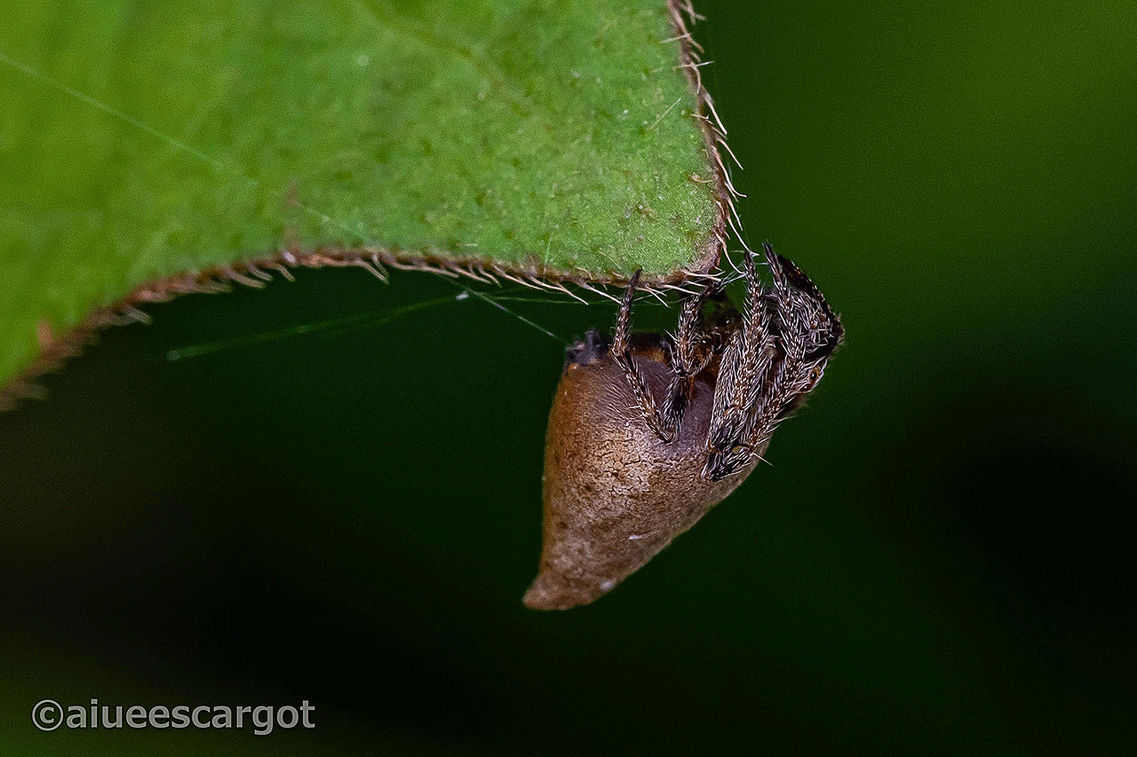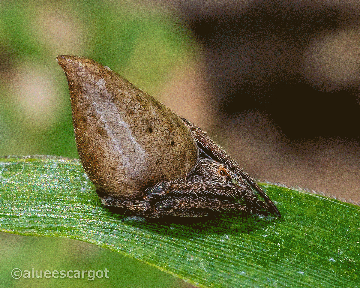 葉っぱの先っぽに鎮座するチッチャいトガリオニグモ。ウワサには聞いていましたが初見です。