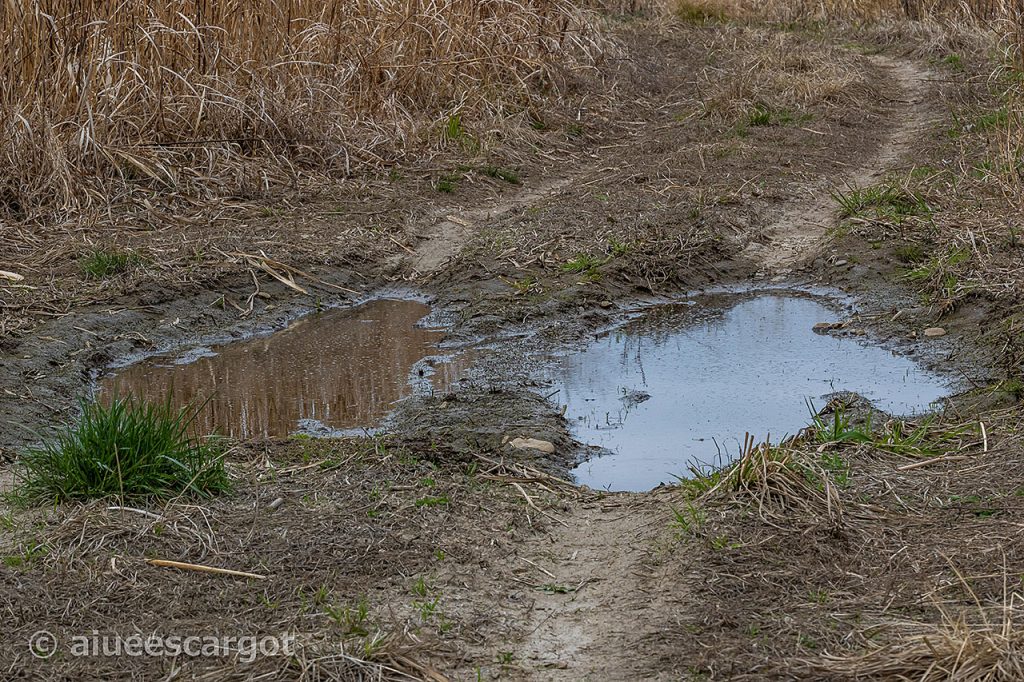水がなくなって干上がってしまった轍。成長した姿で地中深い場所で乾燥期を乗り切るカエルの話は聞いたことはあるが、オタマジャクシにそんなパワーがあるとは思えない。