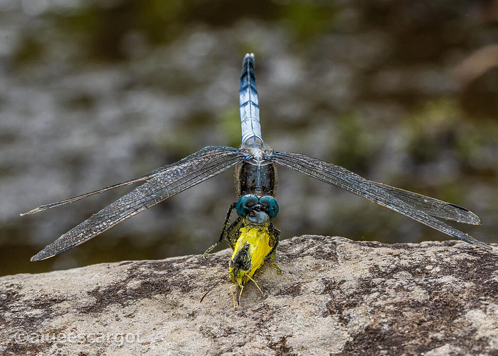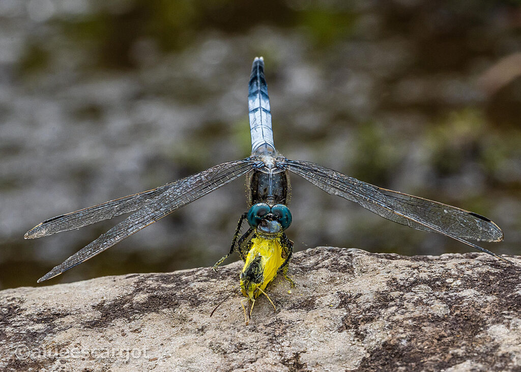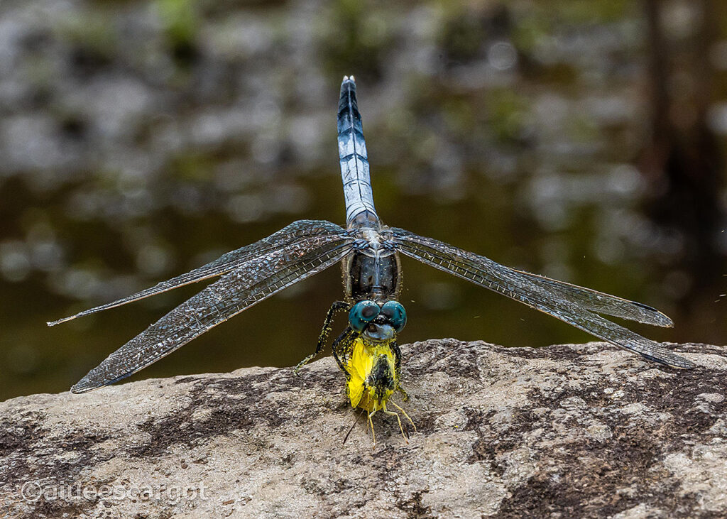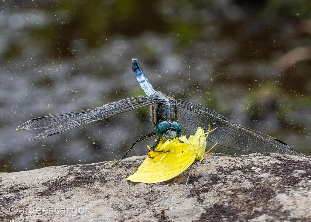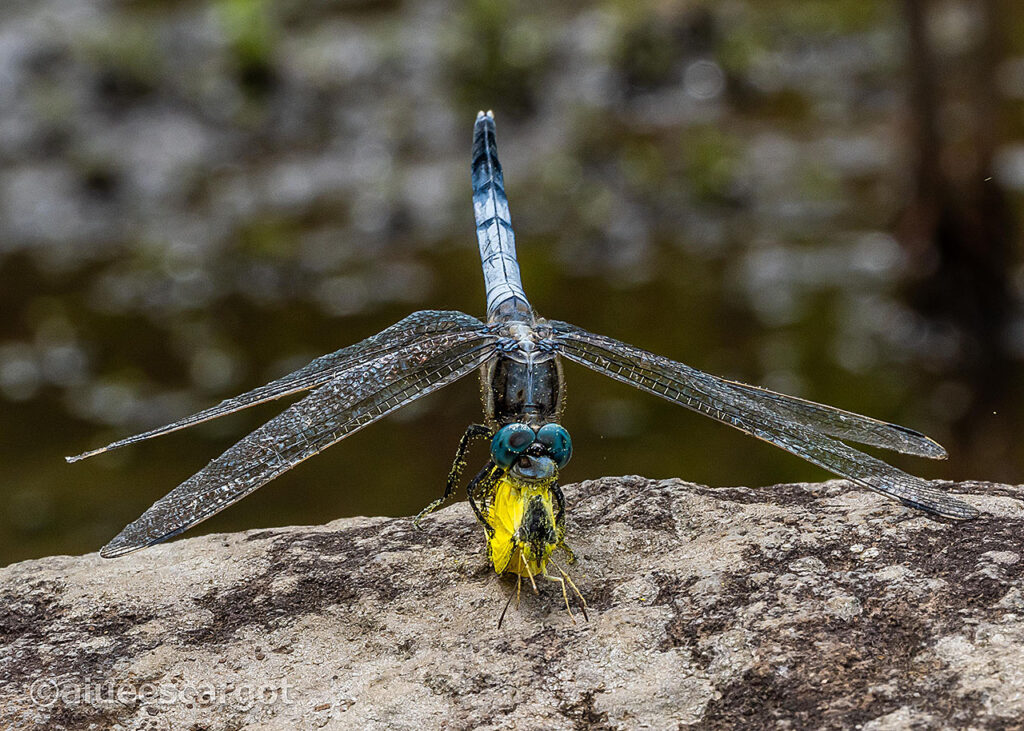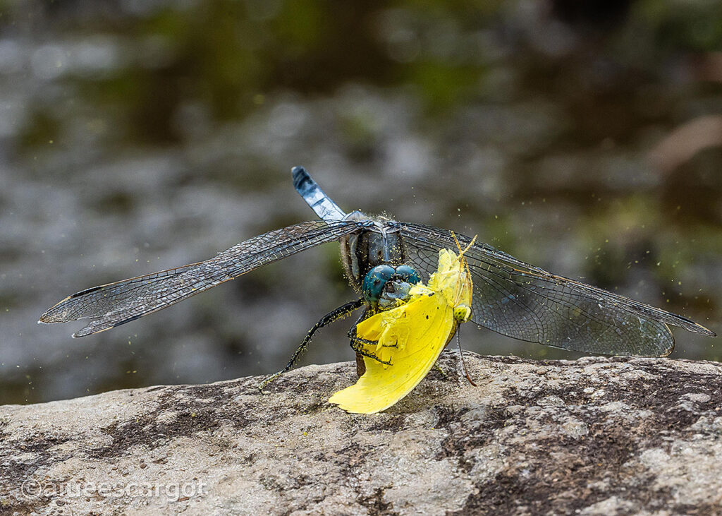 すっかり水が干上がった池?の上でキチョウをフライングキャッチしたシオカラトンボが、意気揚々と岸辺に止まった・・・