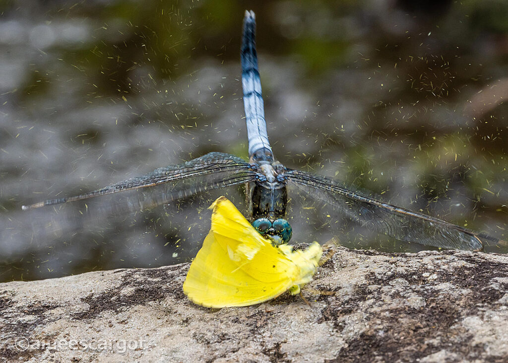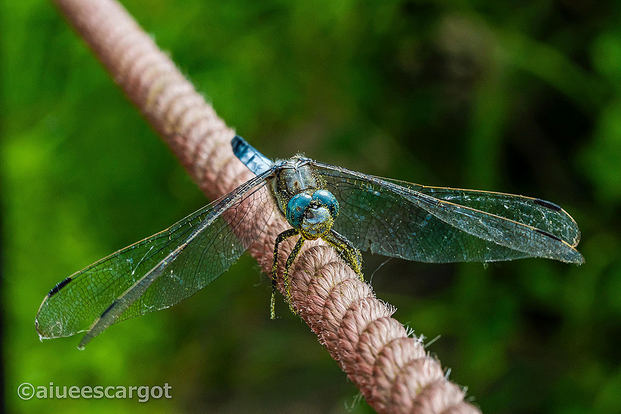 おわりの画像は、キチョウに逃げられ全身鱗粉まみれでロープに止まるシオカラトンボの姿。