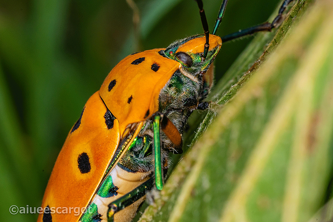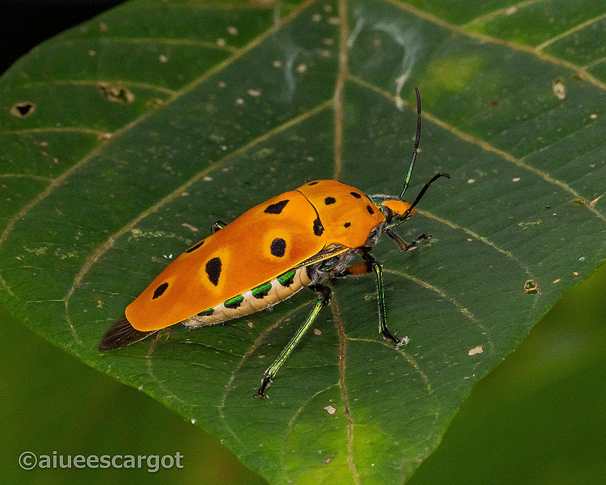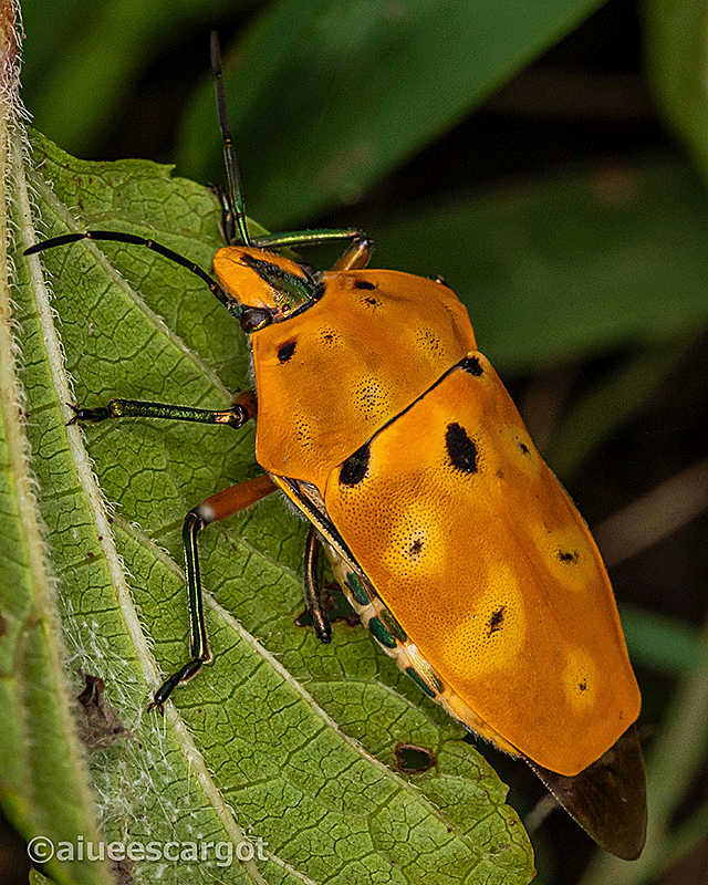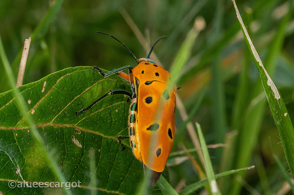 雨上がり、アカメガシワの葉の上にこれまで見たことのない大きく鮮やかなオレンジ色のカメムシ?を見つけた。「まさか、まさか、キンカメ!?」と思いながら、動く様子がなかったのでスマホで撮影・検索。