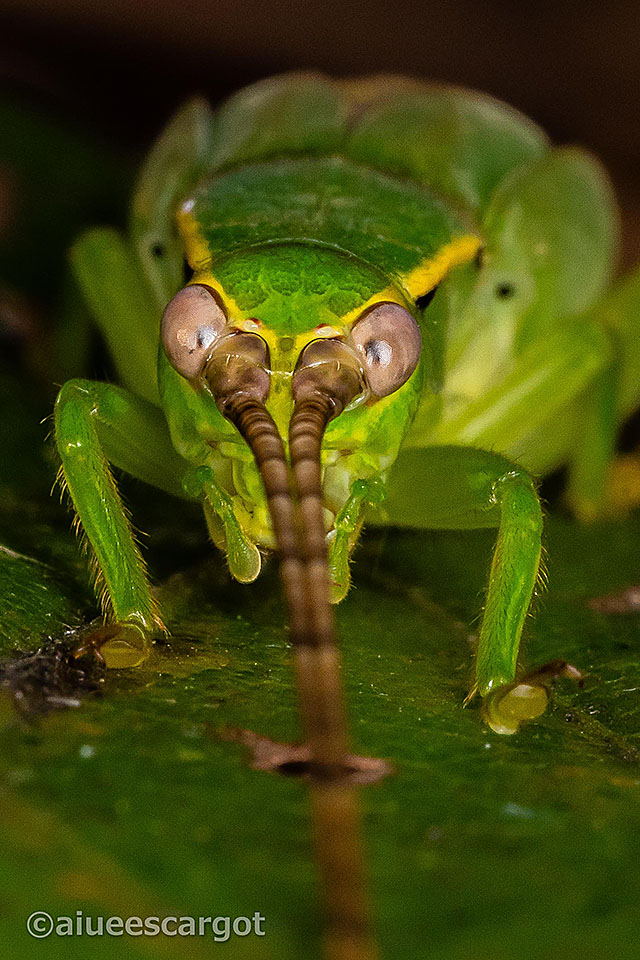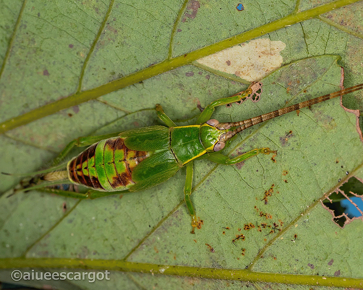 葉のような色をしたアオマツムシ。今回、葉と葉の間にジッとしているムシを見つけたときは”これが何者なのか”わからず、葉をめくって初めてアオマツムシの幼虫だと理解した。