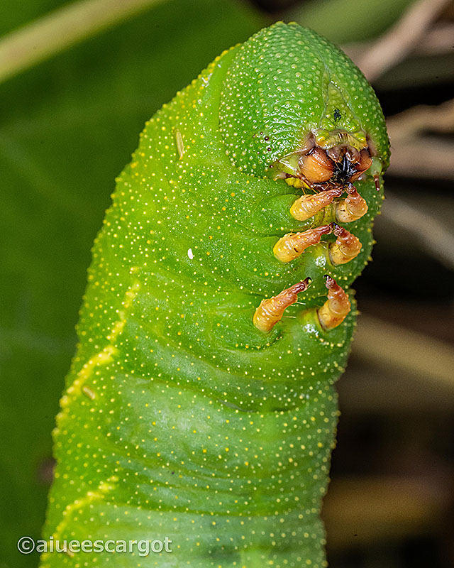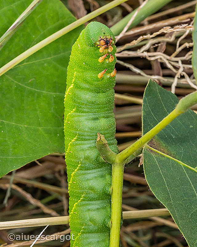 終齢幼虫なのだろうか、外見は丸くてふっくらした頭頂部と大きな(ゆうに70ミリ以上)カラダをしている。尾角は短め、スズメガの幼虫らしい。