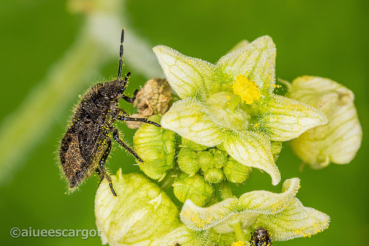 アレチウリの小さな花の上を歩く毛深い小さなムシ。