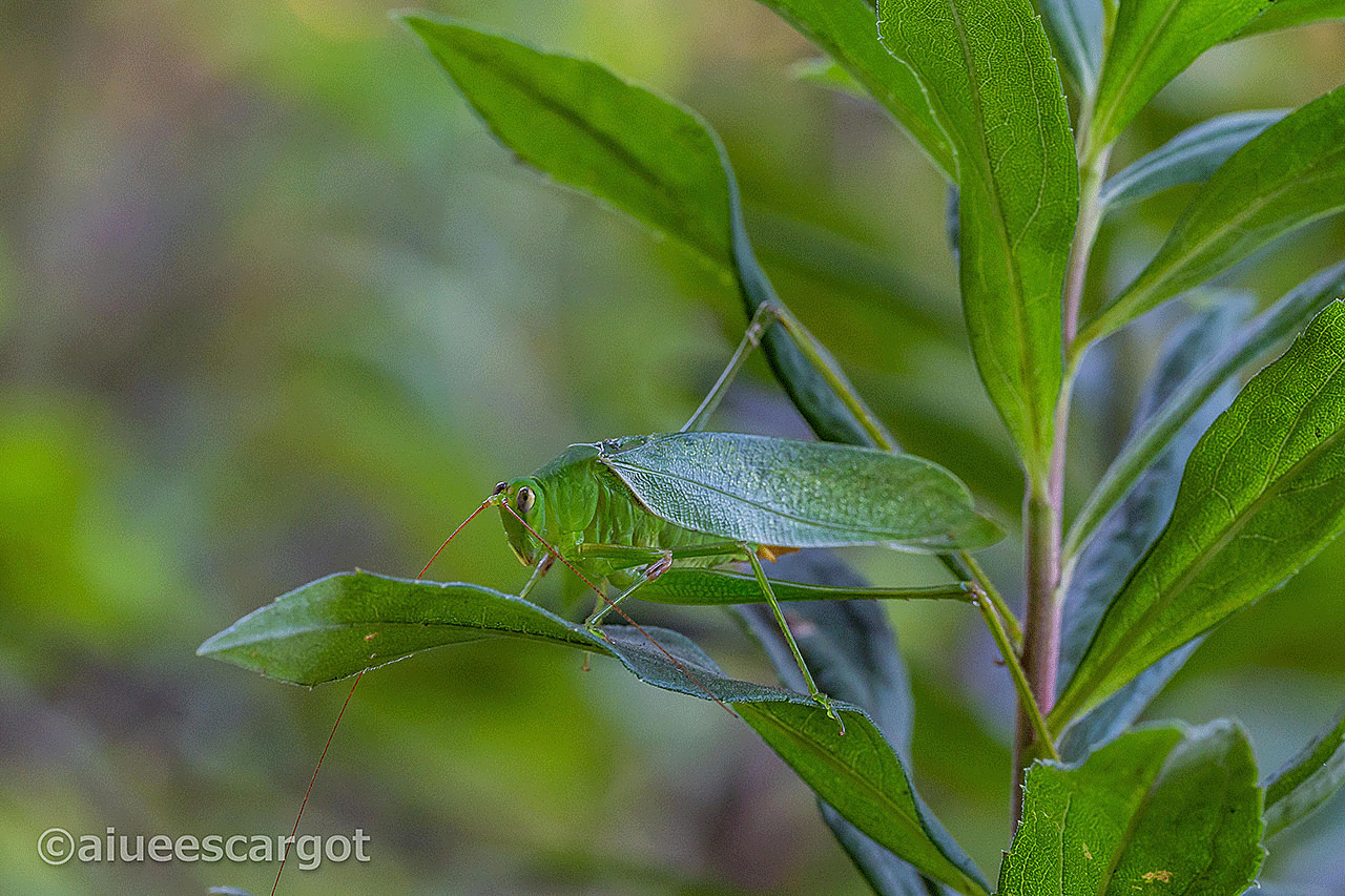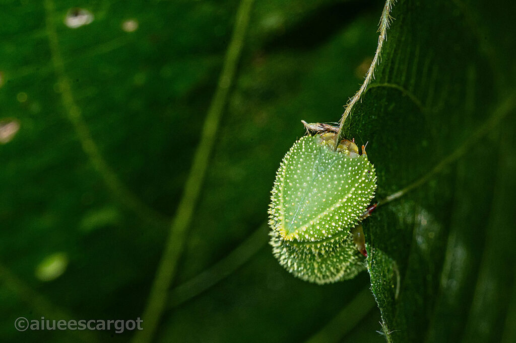 鬱蒼と木々に覆われた場所で、ジッと葉に止まって動かないサトクダマキモドキを見つけた。形がよく似たヤマクダマキモドキがいるが、ヤマは前脚が赤紫色、サトクダマキモドキの前脚は緑色なので、パッと見ただけでどのクダマキなのか区別できます。