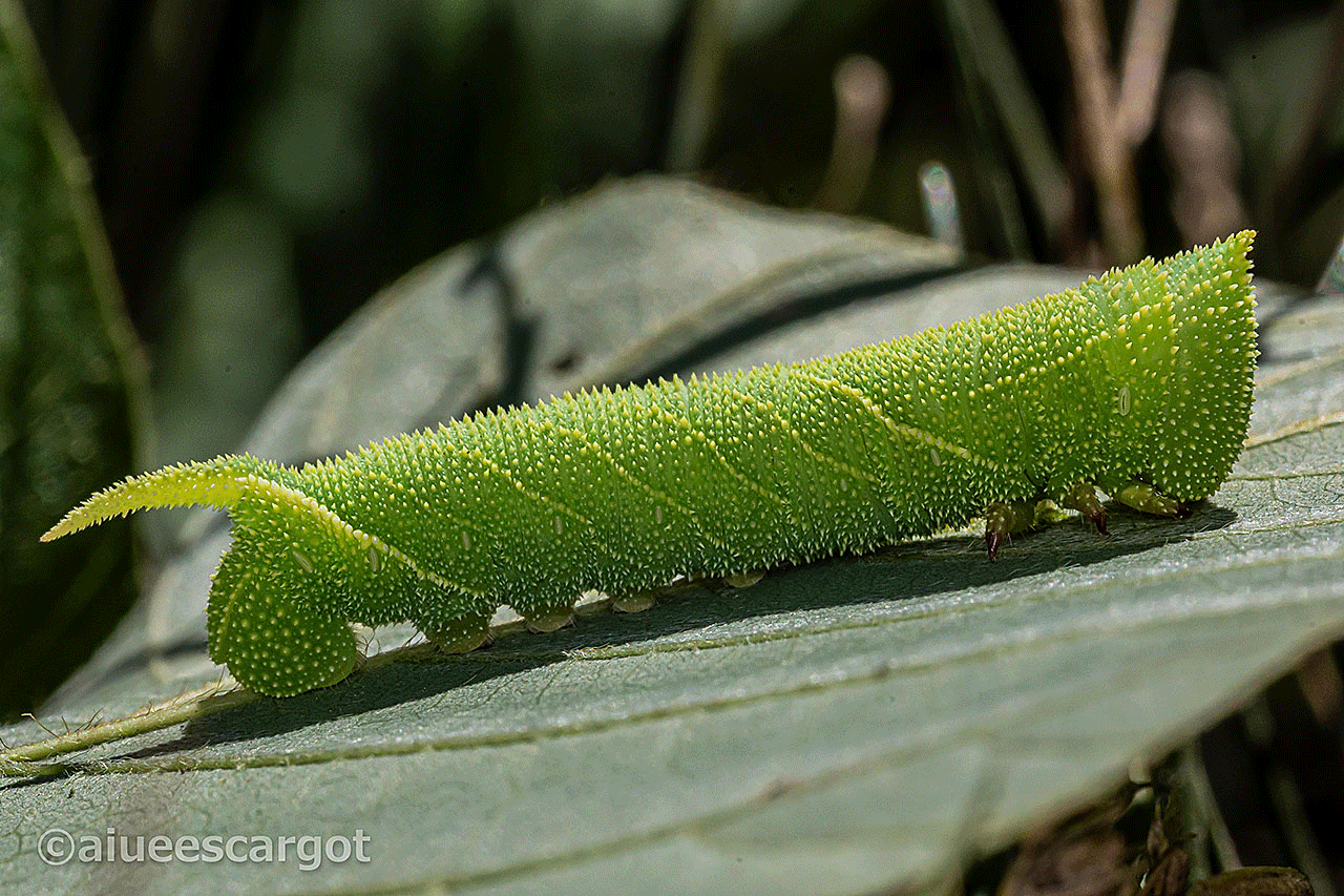 少し前にトビイロスズメの幼虫を見つけた同じ場所でモモスズメの幼虫を見つけた。色合いはトビイロスズメの幼虫と同じだが、ちょっと小ぶりで、頭部が縦長三角形なので、すぐにモモスズメの幼虫だとわかった。