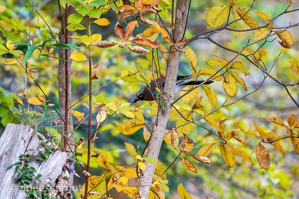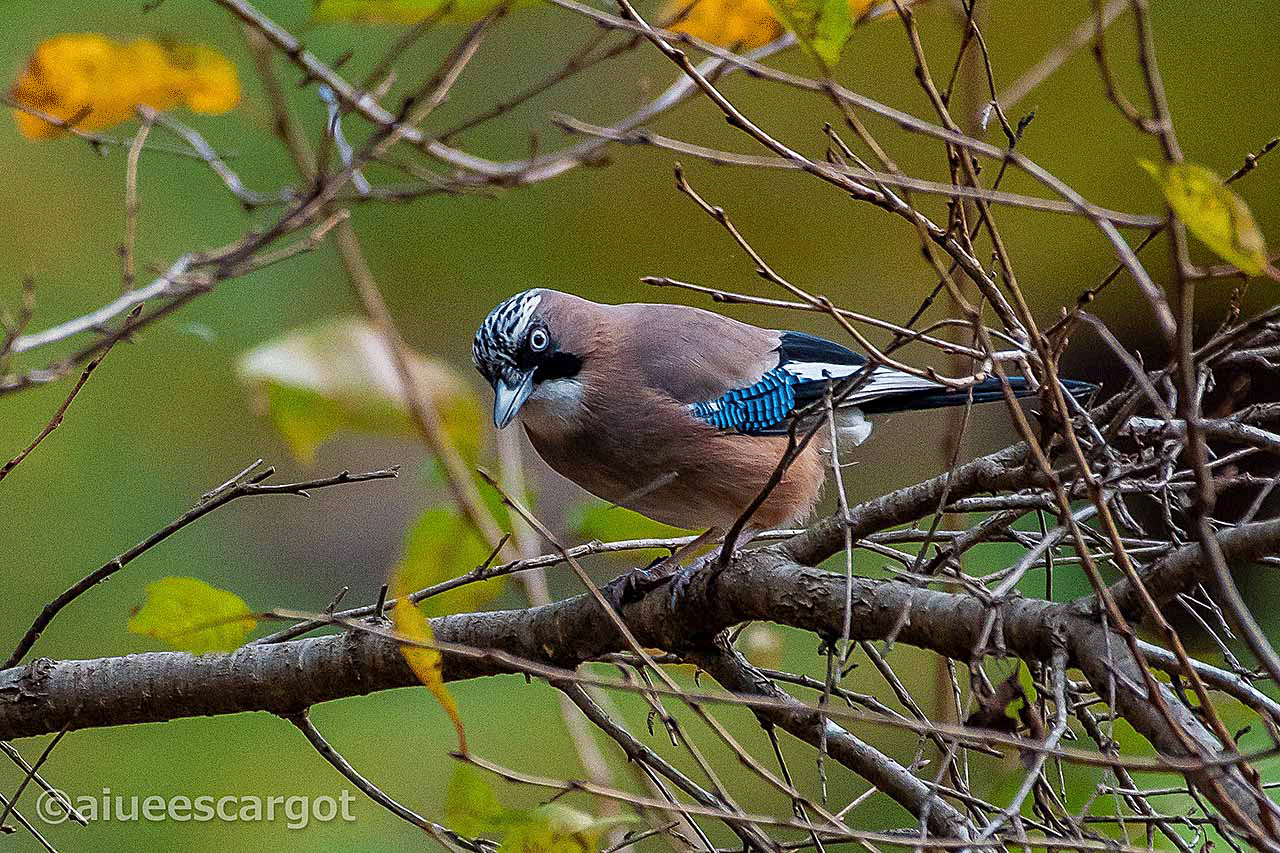すっかり秋色の森を活発に飛びまわるのはカケス。上の画像は大きめのクモをゲットし、ご機嫌な様子のカケスと捕らえられてしまったクモから延びる無念の糸。