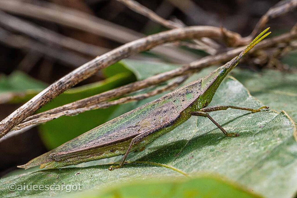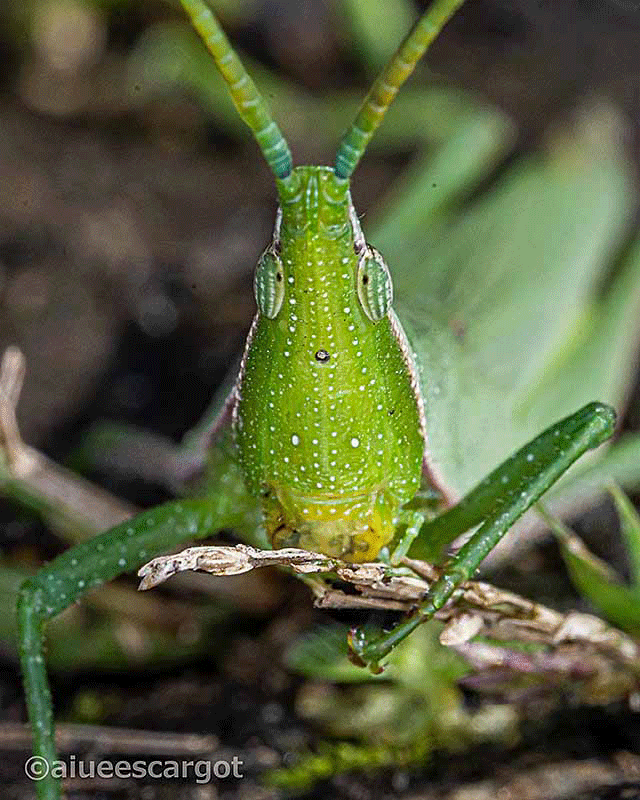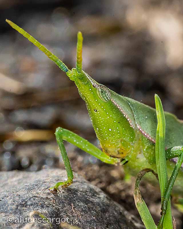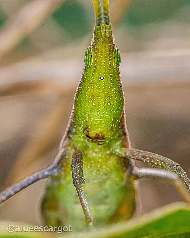 頭の両サイドに白いイボイボがあるのがオンブバッタ。よく似たシリョウリョウバッタにはイボイボはありません。