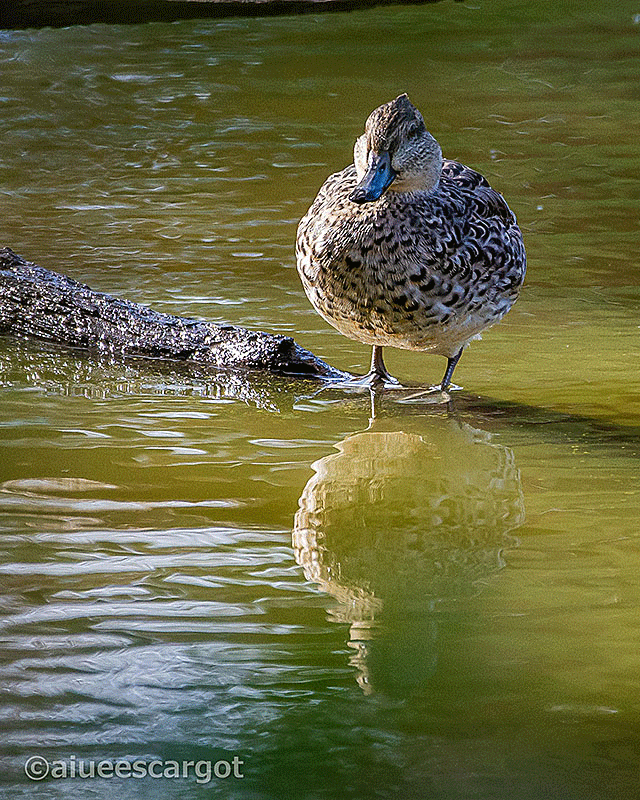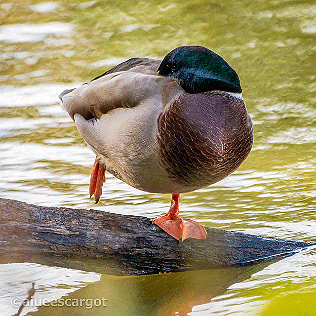 普通なら人の気配をキャッチすると大声で鳴きわめきながら逃げ去ってしまうマガモですが、岸辺の倒木の上でウトウトしていたオスのマガモ。