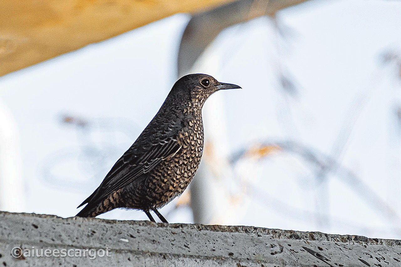 こちらは大きな橋の下で撮ったイソヒヨドリのメス。薄暗い橋の下でしたが、白い点を散りばめた暗灰色のちょっと渋めのメスの姿は撮れました。
