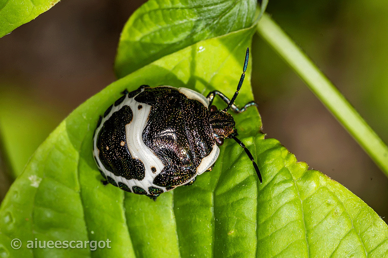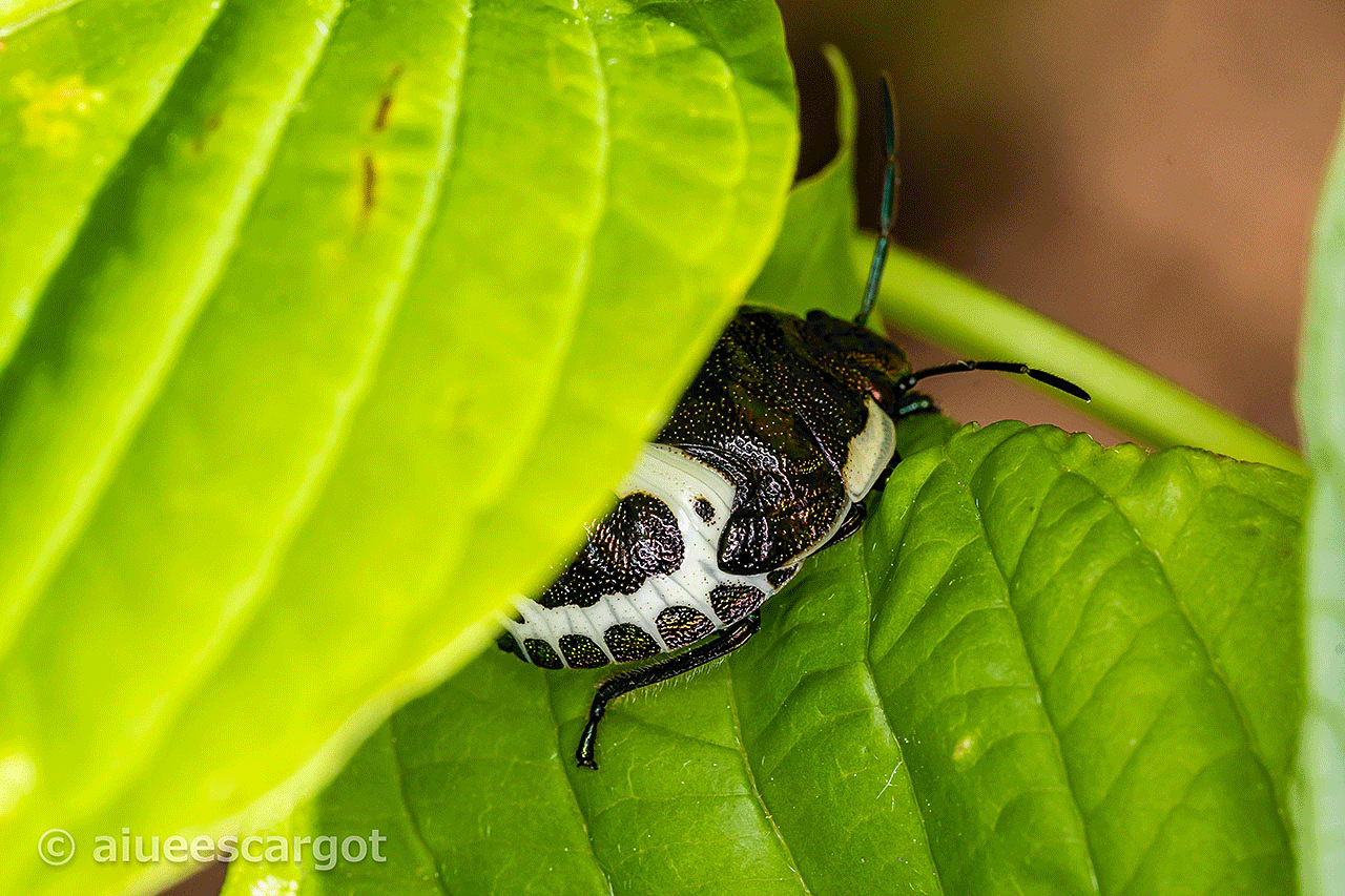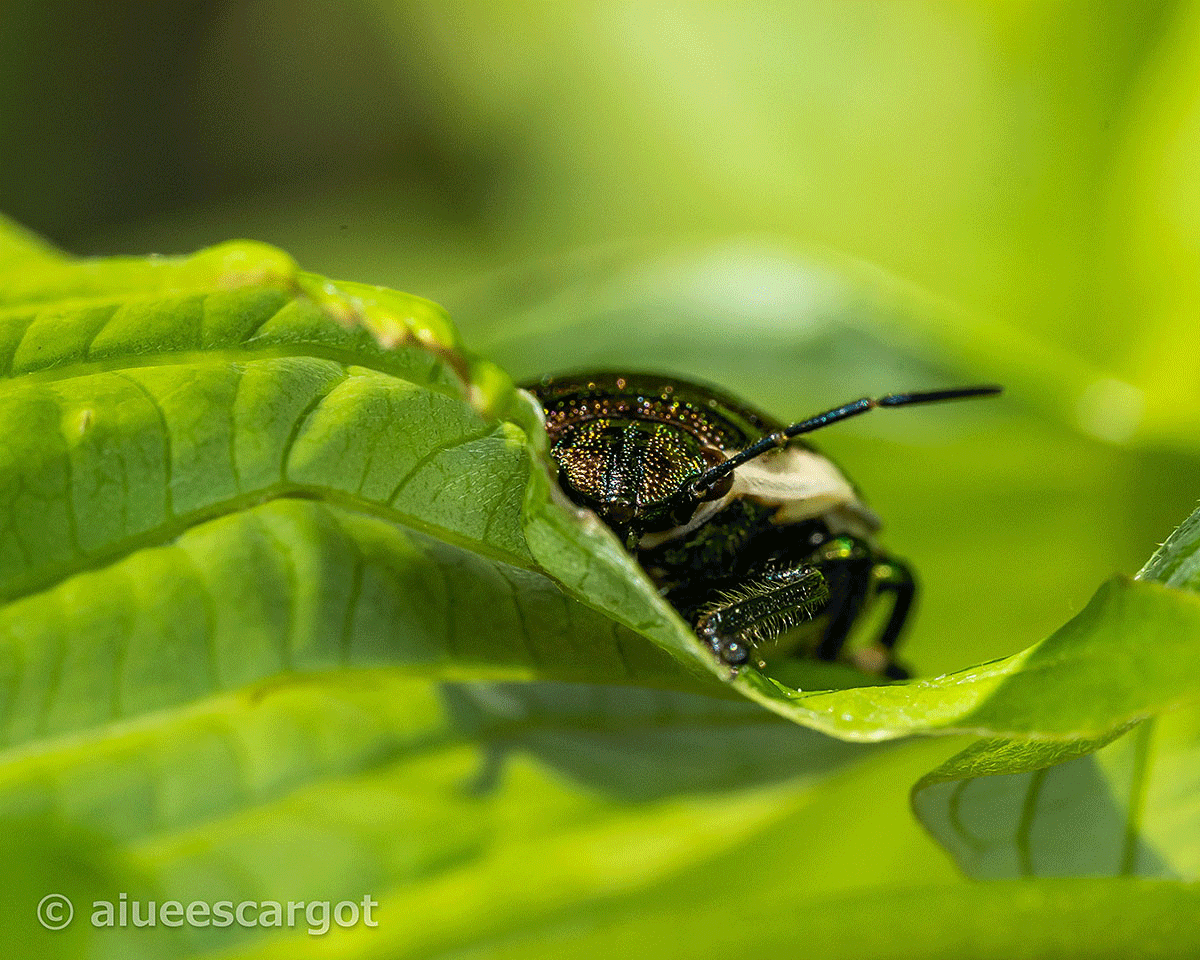 このところ、いつもほぼ同じ場所にいる一匹のアカスジキンカメムシ。