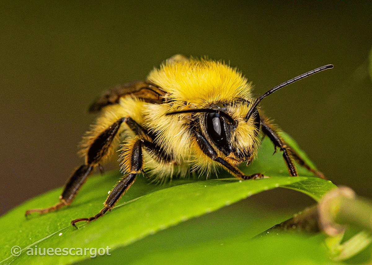 快速が売りのぬいぐるみのようなコマルハナバチが葉の上でモゾモゾしている。普通なら近づこうとしただけで、逃げられてしまう相手だ (゚〇゚;)