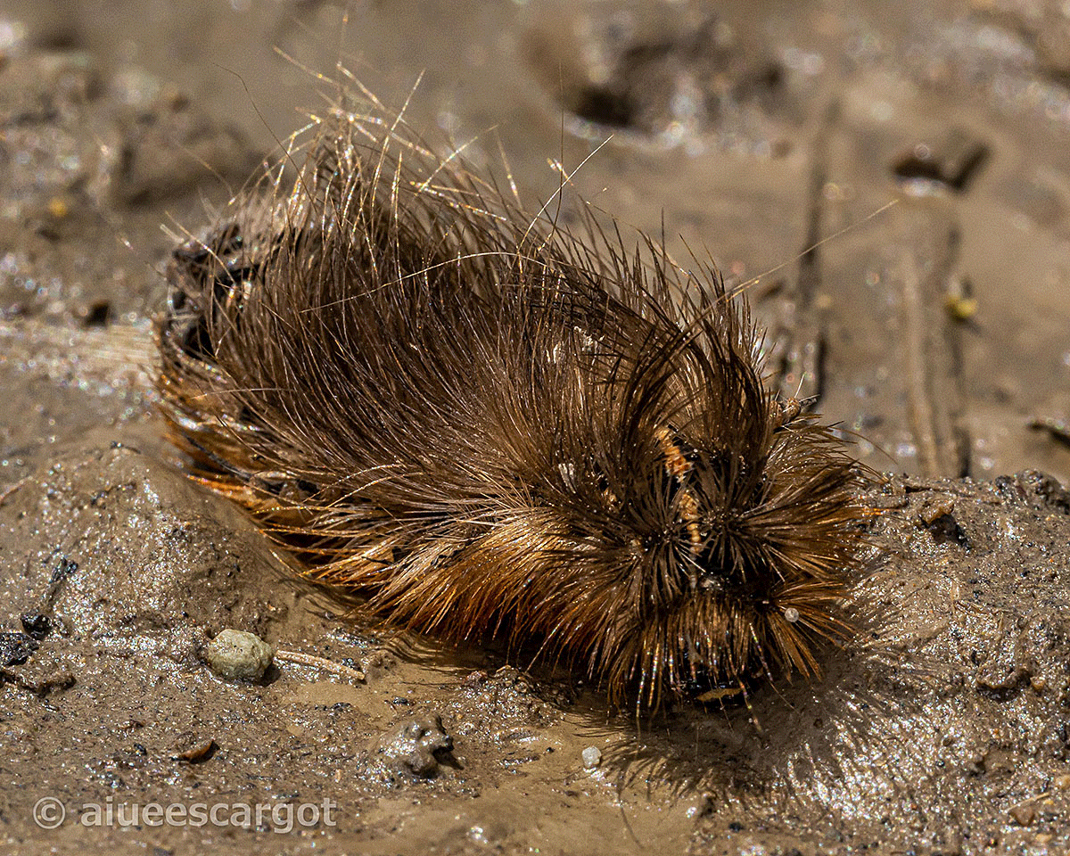 雨上がりの道端でシロヒトリの5齢幼虫と思われるケムシに遭遇。