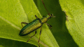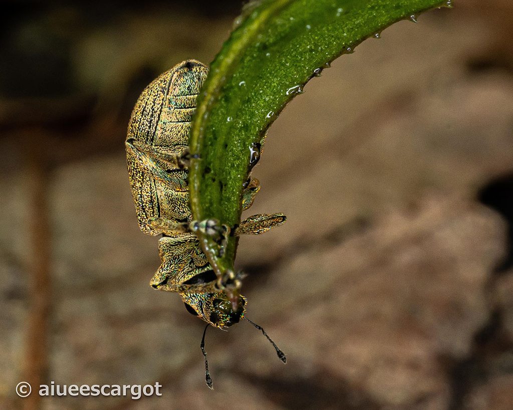 先日コフキゾウムシを見つけ撮影していると、殺気を感じたのか彼女は ” 落ち逃げ ” 行動にでた。普通ならばそこで見失ってしまうはずだったが、彼女は下へは落ちず、すぐ下の葉っぱの上へ・・・。